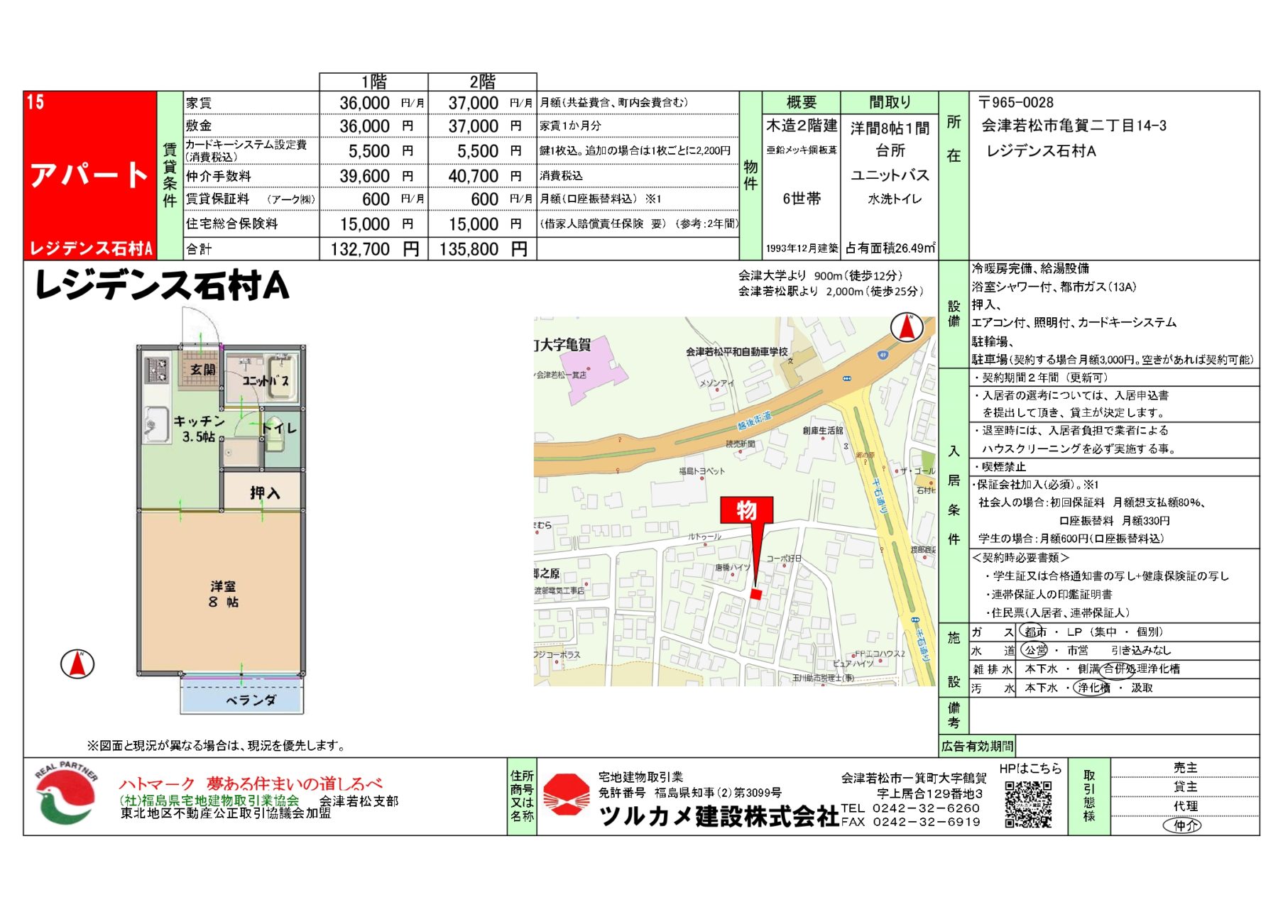 | 交通 | JR磐越西線 会津若松 徒歩26分 | 所在地 | 福島県会津若松市亀賀二丁目14-3 |